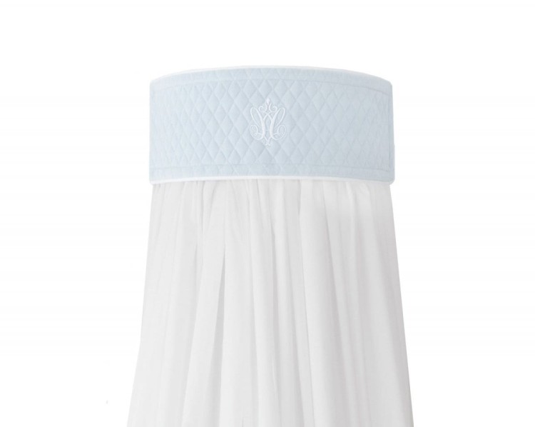 Zjawiskowy baldachim do pokoiku dziecka. Wykonany z satynowej białej bawełny oraz wzbogacony eleganckim mocowaniem do ściany w postaci półokręgu. Mocowanie jest pokryte pikowanym błękitnym welurem wykończonym białą kedrą i ozdobionym eleganckim emblematem. Stelaż został tak zaprojektowany, aby tkaniny oraz dekoracyjną część mocowania można było łatwo zdemontować do prania.