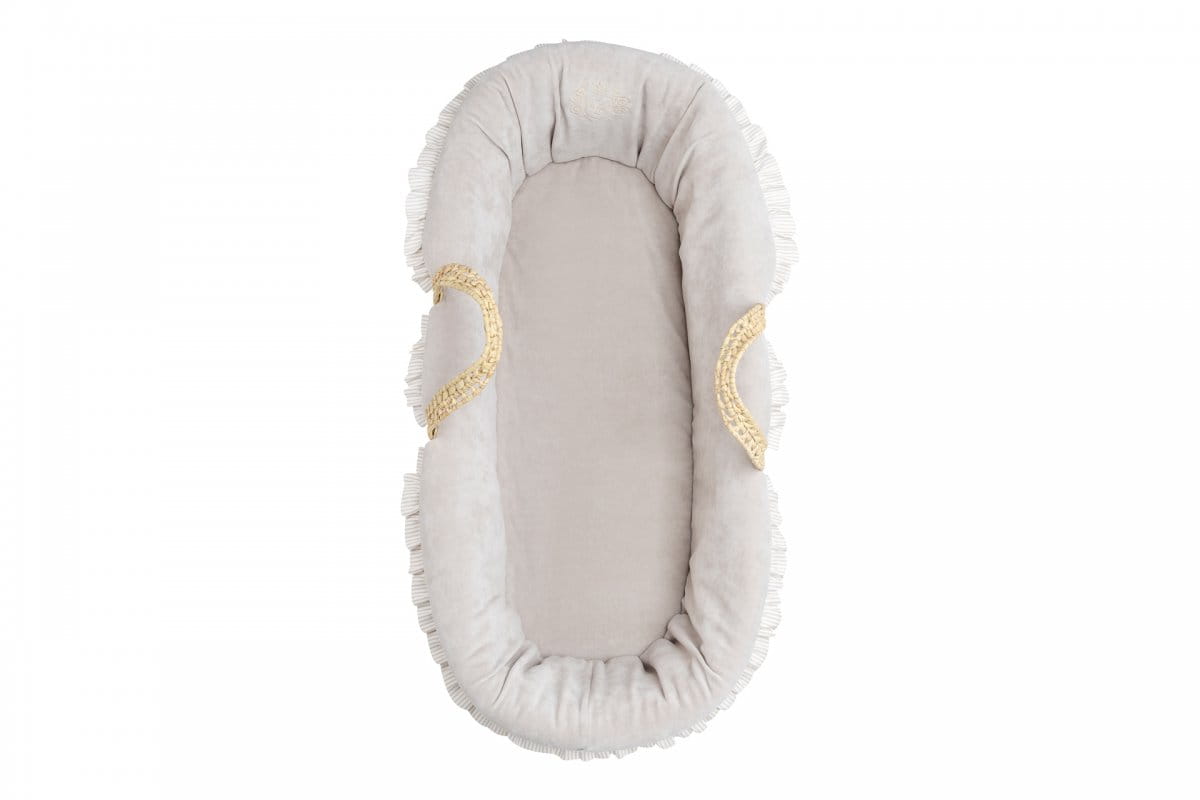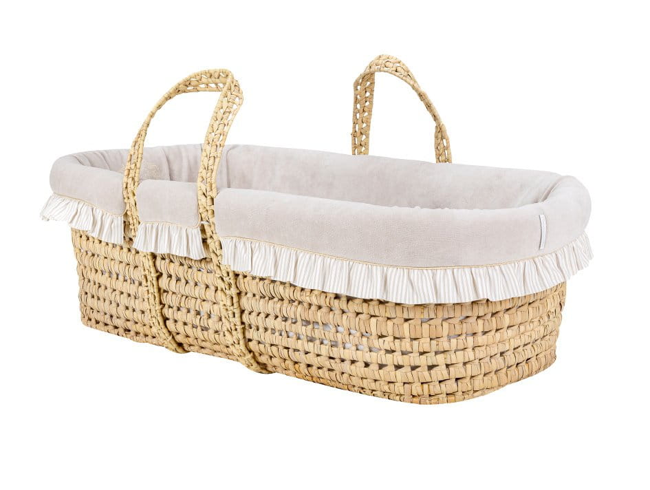 Kosz mojżeszowy wykonany z bezpiecznych dla dziecka liści palmowych. Posiada przywiązywane drobnymi troczkami obszycie z weluru w odcieniu delikatnego beżu oraz owalny materacyk. Obszycie udekorowane zostało eleganckim złotym haftem firmowym oraz uroczą falbanką. Kosz Mojżesza zapewnia dziecku przytulne miejsce do snu oraz poczucie komfortu. Dzięki temu, że jest lekki, młoda mama bez problemu może się z nim przemieszczać. Może stać bezpośrednio na łóżku rodziców, na kanapie, czy na podłodze. Kosz świetnie sprawdzi się również podczas wyjazdów.