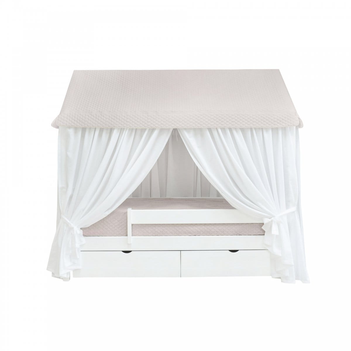 Wspaniałe łóżko w kształcie domku, wymarzone dla małych dziewczynek. Łóżko stworzy niepowtarzalną, bajkową atmosferę w pokoju Twojej córeczki. Daszek wykonany jest z pikowanego materiału bawełnianego w kolorze beżowym, a 'ściany' z delikatnej, białej mgiełki, ozdobionej dwiema uroczymi kokardkami.
