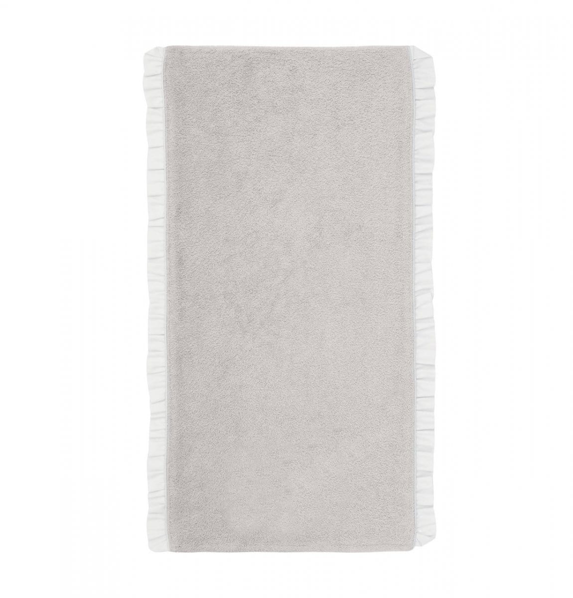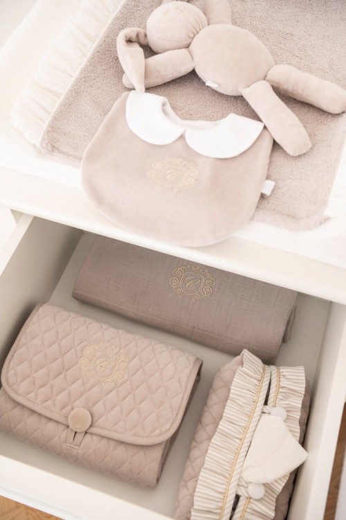 Nakładka na przewijak chroni go przed zmoczeniem. Wykonana z beżowej tkaniny frotte, ozdobiona transparentną falbanką z woalu