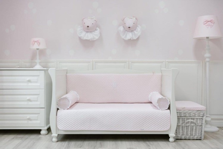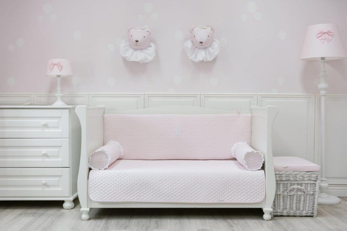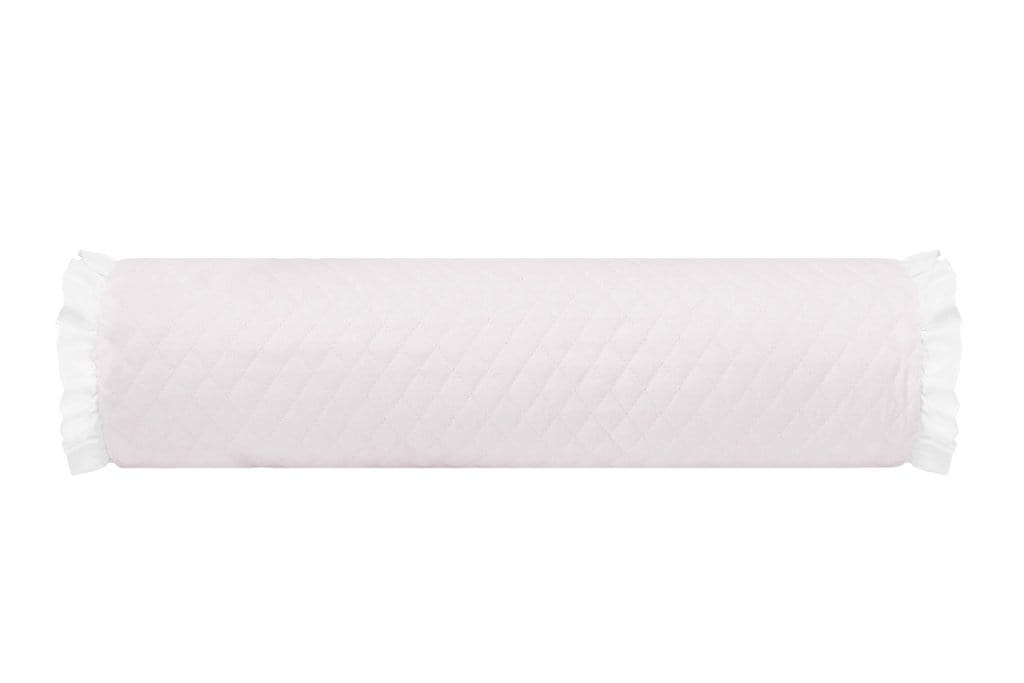 Uroczy i stylowy wałek poduszka. Uszyty z miękkiej, pikowanej bawełny w kolorze pudrowego różu i ozdobiony uroczymi falbankami.