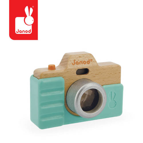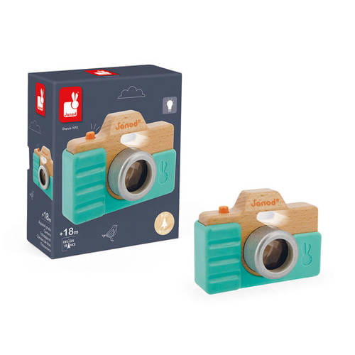 Drewniany aparat francuskiej marki JANOD to idealny prezent dla małego fana fotografii. Został bardzo estetycznie wykonany, z dbałością o wszystkie detale. Ma zdejmowaną silikonową obudowę w kolorze jasno turkusowym, obiektyw-kalejdoskop, spust migawki, którego naciśnięcie wywołuje charakterystyczny dla prawdziwego aparatu dźwięk, a nawet lampę błyskową! :)