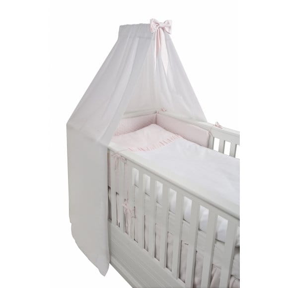 Elegancki stojący baldachim do pokoju dziecięcego. Wykonany z białej bawełny satynowej i ozdobiony uroczą pudrową kokardą. Baldachim to piękny dodatek, który sprawi,że w łóżeczku Twojego dziecka będzie przytulniej, a maleństwo poczuje się bezpieczniej.