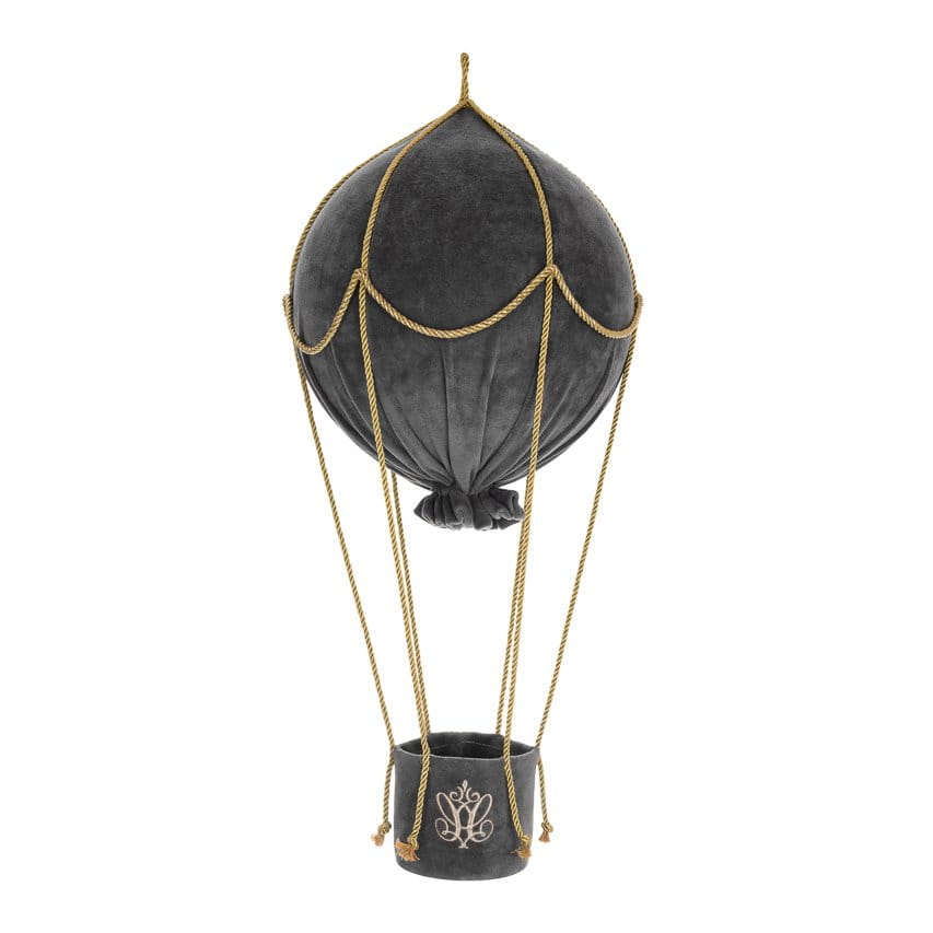 Dekoracyjny balon do pokoju dziecięcego wykonany z antracytowej tkaniny welurowej oraz ozdobiony eleganckim złotym emblematem.