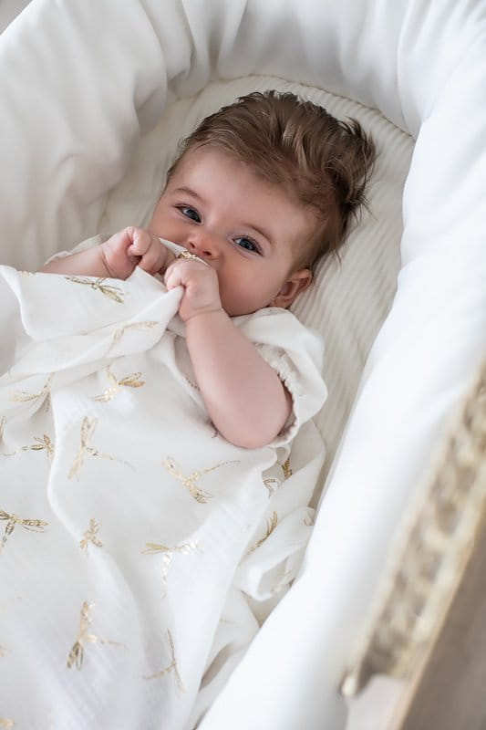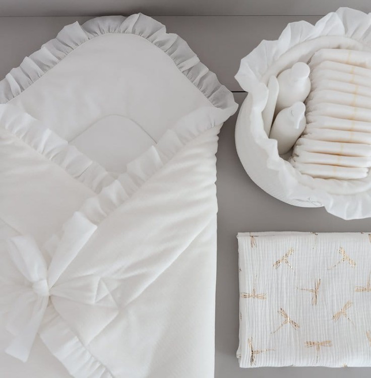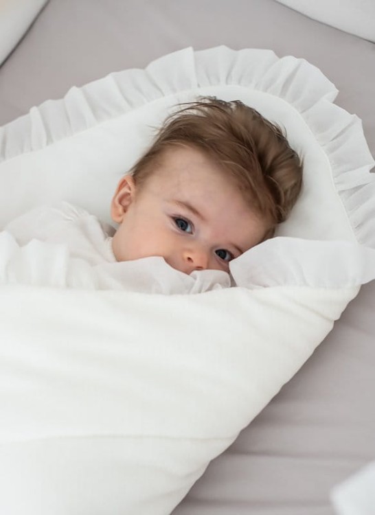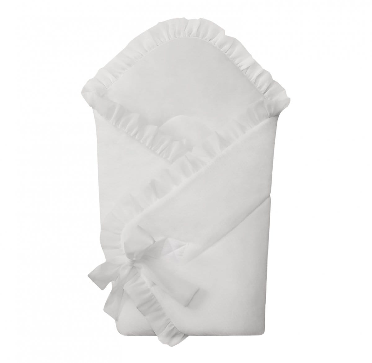 Elegancki becik dla noworodka. Rożek wykonany jest z welurku w odcieniu kości słoniowej i wypełniony włókniną, dzięki czemu jest bardzo cieplutki. Udekorowany transparentną falbanką z woalu. Becik jest bardzo wygodny w użytkowaniu - wiązany na kokardkę. Nie posiada usztywnienia, a po rozłożeniu doskonale sprawdzi się również jako letnia kołderka.