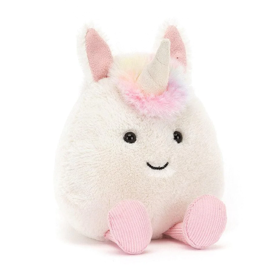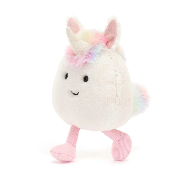 Jednorożec marki Jellycat to bardzo milutki i przyjemny w dotyku pluszak. Ma grube futerko w kolorze kremowym, piękny różek otoczony tęczową grzywą, sterczące uszka, uśmiechniętą buźkę, mięciutki brzuszek, sztruksowe óżowe stópki i tęczowy ogonek. Ten uroczy łobuziak lubi psocić, bawić się i przytulać. Pluszak został uszyty z najwyższej jakości, trwałych i bezpiecznych dla dzieci materiałów.