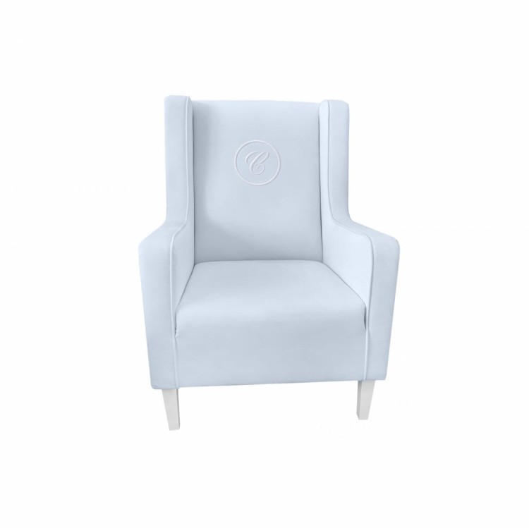 Duży, bardzo wygodny fotel typu "uszak" w stylu nowoczesnym, pokryty wysokiej jakości tkaniną zmywalną w kolorze błękitnym. Fotel ozdobiony jest szykowną białą kedrą oraz ekskluzywnym emblematem z literką "C". Ze względu na wysokie oparcie, "uszy" pod głowę oraz podłokietniki doceni go każda mama karmiąca. Fotel idealnie wpasuje do wnętrza - pokoju dziecięcego, salonu, sypialni i nie tylko.
