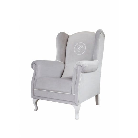 Duży, bardzo wygodny fotel typu "uszak" pokryty wysokiej jakości tkaniną zmywalną w kolorze jasnoszarym. Fotel ozdobiony jest szykowną białą kedrą oraz ekskluzywnym emblematem z literką "C" w kolorze białym. Ze względu na wysokie oparcie, "uszy" pod głowę oraz podłokietniki doceni go każda mama karmiąca. Fotel pasuje do każdego wnętrza- pokoju dziecięcego, salonu, sypialni i nie tylko.