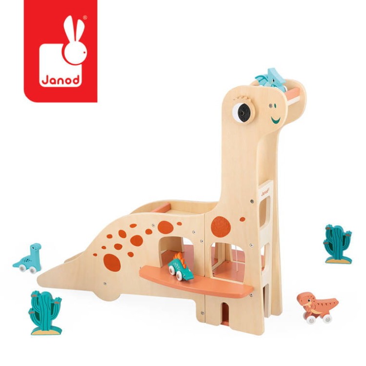 Drewniany piętrowy garaż z serii Dinozaury francuskiej marki JANOD to idealny prezent dla każdego dziecka. Komplet składa się z kilkupoziomowego (4 kondygnacje, najwyższa na poziomie głowy!) garażu w kształcie dinozaura wraz z akcesoriami: 4 pojazdami-dinozaurami i 2 kaktusami. Na najniższym piętrze znajduje się wjazd do windy (wciąganej i opuszczanej ręcznie za pomocą sznurka na bolcu – obraca się go, kręcąc okiem dinozaura), którą pojazdy mogą się przemieszczać do wyższych partii budynku. Zestaw pozwala na tworzenie wielu scenariuszy zabaw.