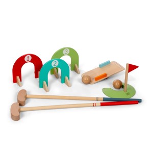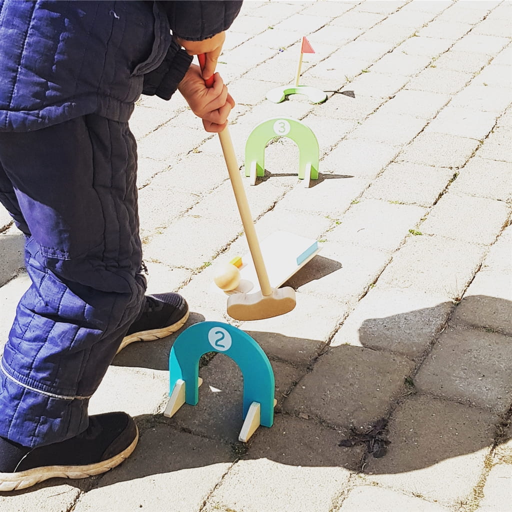 Idealna gra dla dzieci do ćwiczenia precyzji, koncentracji i koordynacji. Zestaw do golfa jest drewniany i pomalowany na jasne, wesołe kolory.