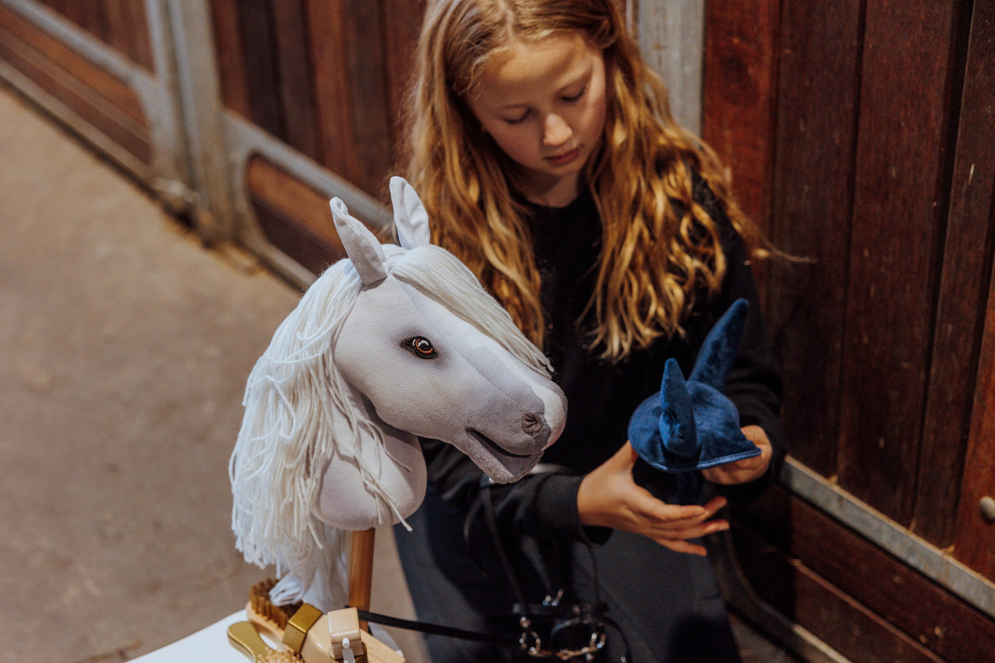 Ubierz konia hobbystycznego w granatowy kocyk i przytulną bonetkę i ciesz się tym, jak utrzymują go w cieple i stylu, niezależnie od tego, czy jest na zewnątrz na podwórku, czy bezpiecznie schowany w stajni lub boksie konia hobbystycznego.