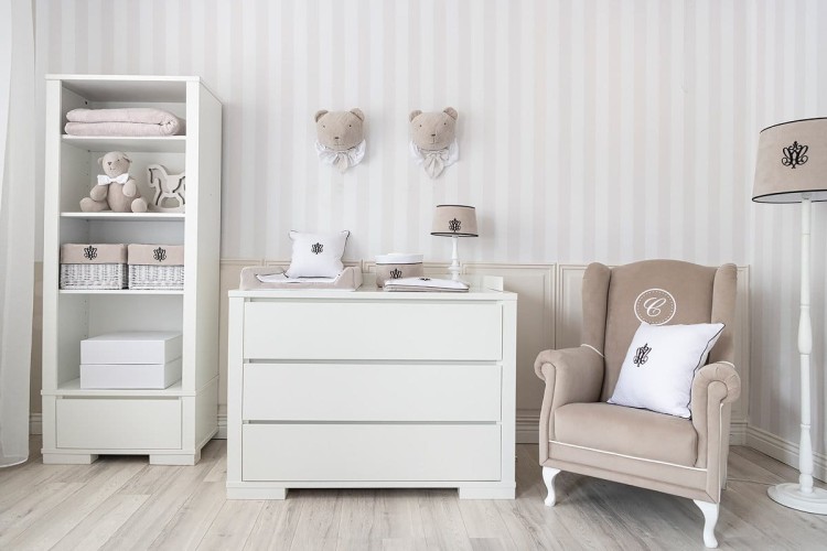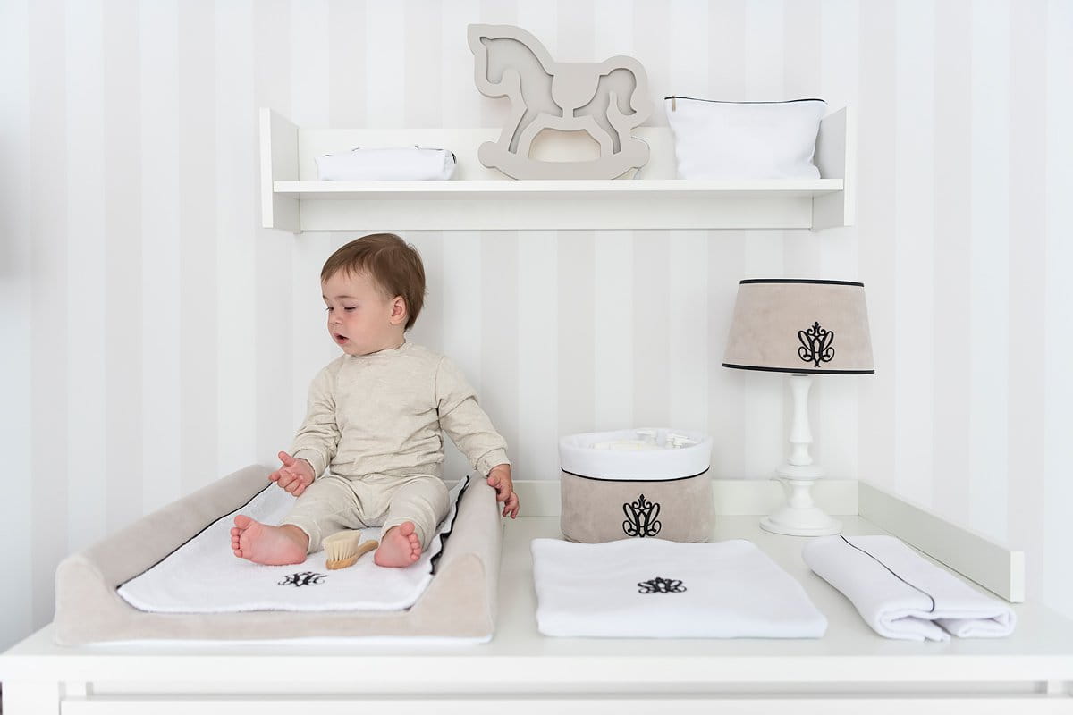 Piękna lampka z welurowym kloszem w kolorze beżowym. Ozdobiona eleganckim czarnym emblematem firmowym i dekoracyjną taśmą. Ta lampka sprawdzi się w każdym pokoiku dziecięcym – jako lampka nocna, na komodę lub na okno.