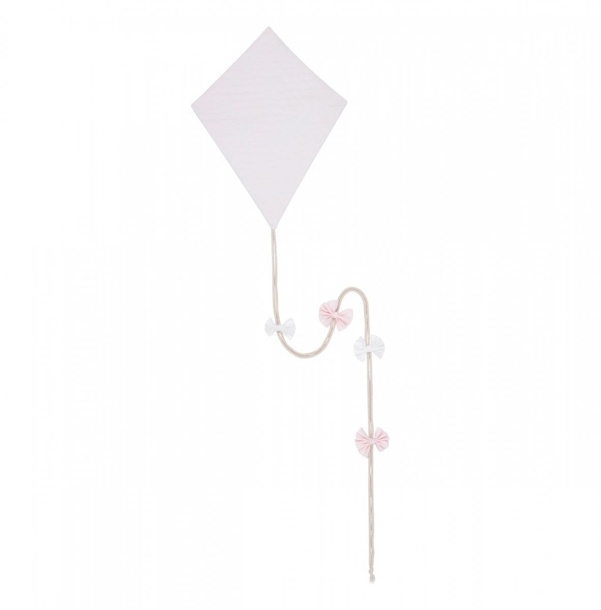 Piękny, ręcznie robiony latawiec dekoracyjny wykonany z pikowanej bawełny w kolorze pudrowym. Sznurek latawca jest ozdobiony uroczymi kokardkami w kolorach białym oraz pudrowym. Latawiec stanowi piękną dekorację zarówno w pokoiku niemowlęcym, jak i starszego dziecka.