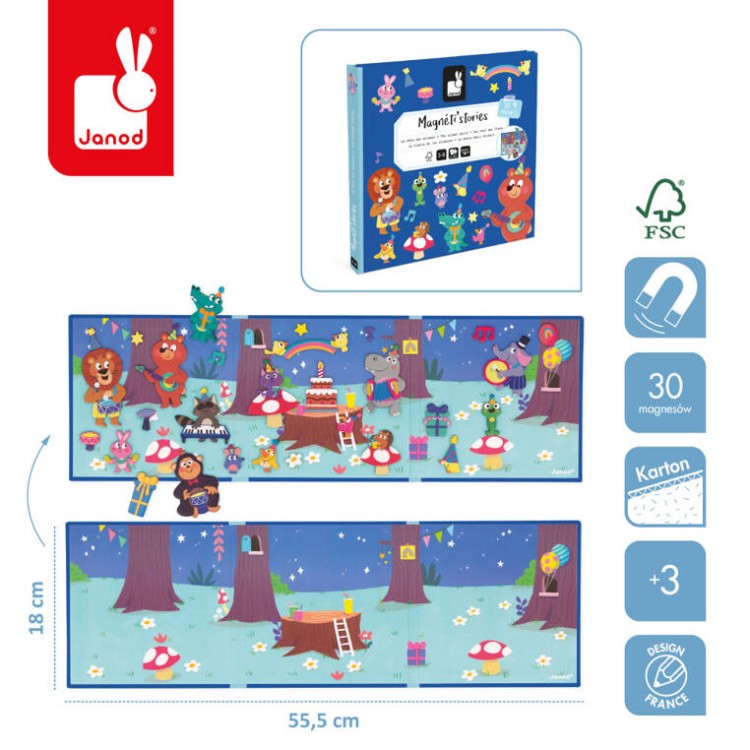 Magnetyczne historie Przyjęcie w lesie z linii Magneti'stories francuskiej marki Janod zawiera 30 magnesów – leśnych zwierząt, gadżetów urodzinowych, imprezowych ozdób, prezentów itp., które stanowią części składowe do stworzenia oryginalnej ilustracji na rozkładanej potrójnej planszy. Magnesy pozwalają na układanie wymyślonych przez siebie opowieści, których bohaterami są leśni przyjaciele. To świetna rozrywka dla wszystkich twórczych dzieci.