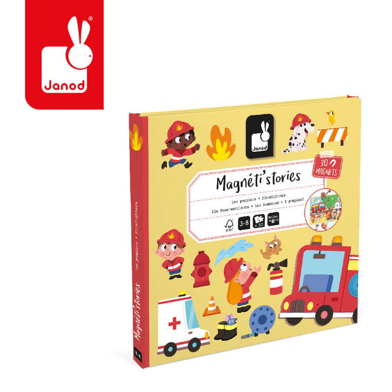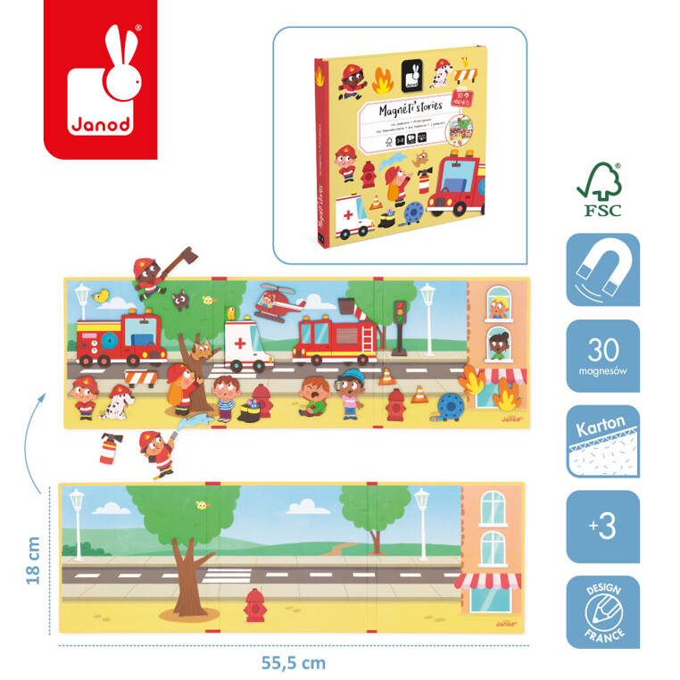 Magnetyczne historie Strażacy z linii Magneti'stories francuskiej marki Janod zawiera 30 magnesów – strażaków, ognia, zwierząt, pojazdów i innego wyposażenia ratowniczego, które stanowią części składowe do stworzenia oryginalnej ilustracji na rozkładanej potrójnej planszy. Magnesy pozwalają na układanie wymyślonych przez siebie opowieści, których bohaterami są strażacy w akcji. To świetna rozrywka dla wszystkich twórczych dzieci.