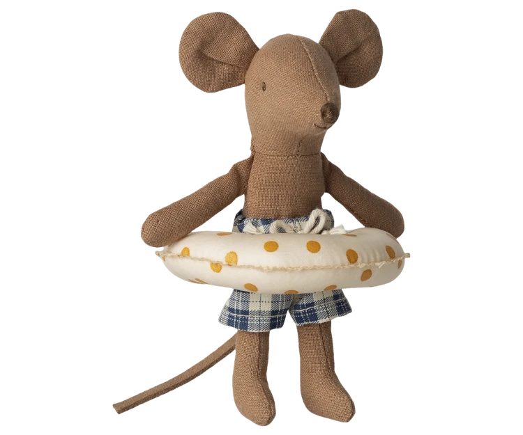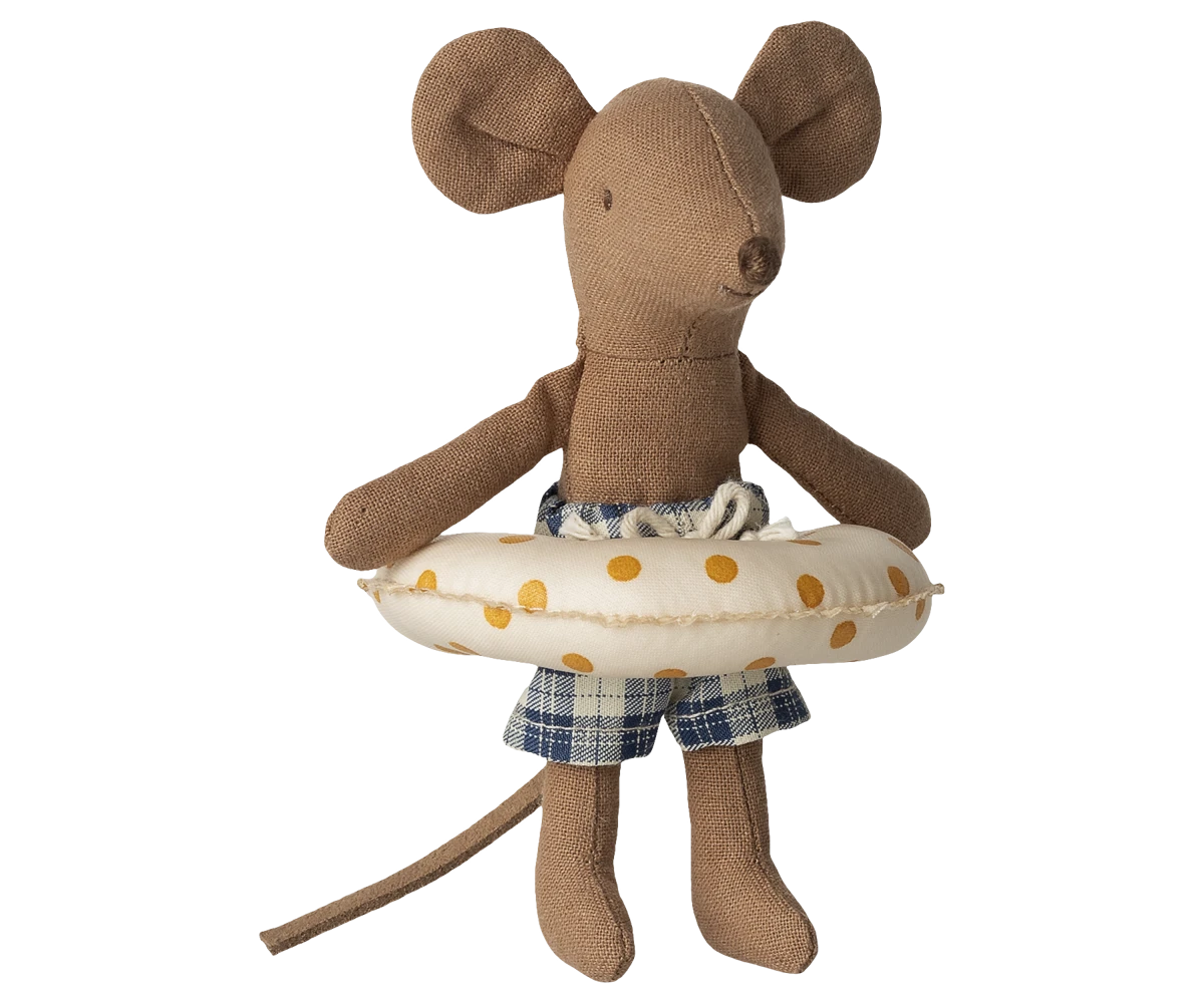 Scenka gotowa: słodki myszek plażowy w kąpielówkach i z kołem. Gotowy na dzień na plaży lub w ogrodowym basenie – ogranicza tylko wyobraźnia.