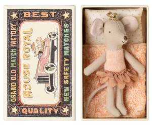 Klasyczny produkt Maileg. Ta mysz jest gotowa na wiele godzin zabawy i śpi ciasno w małym pudełku zapałek. Ubrania i pościel mają unikalne nadruki i piękne kolory. Pościel może różnić się kolorem.