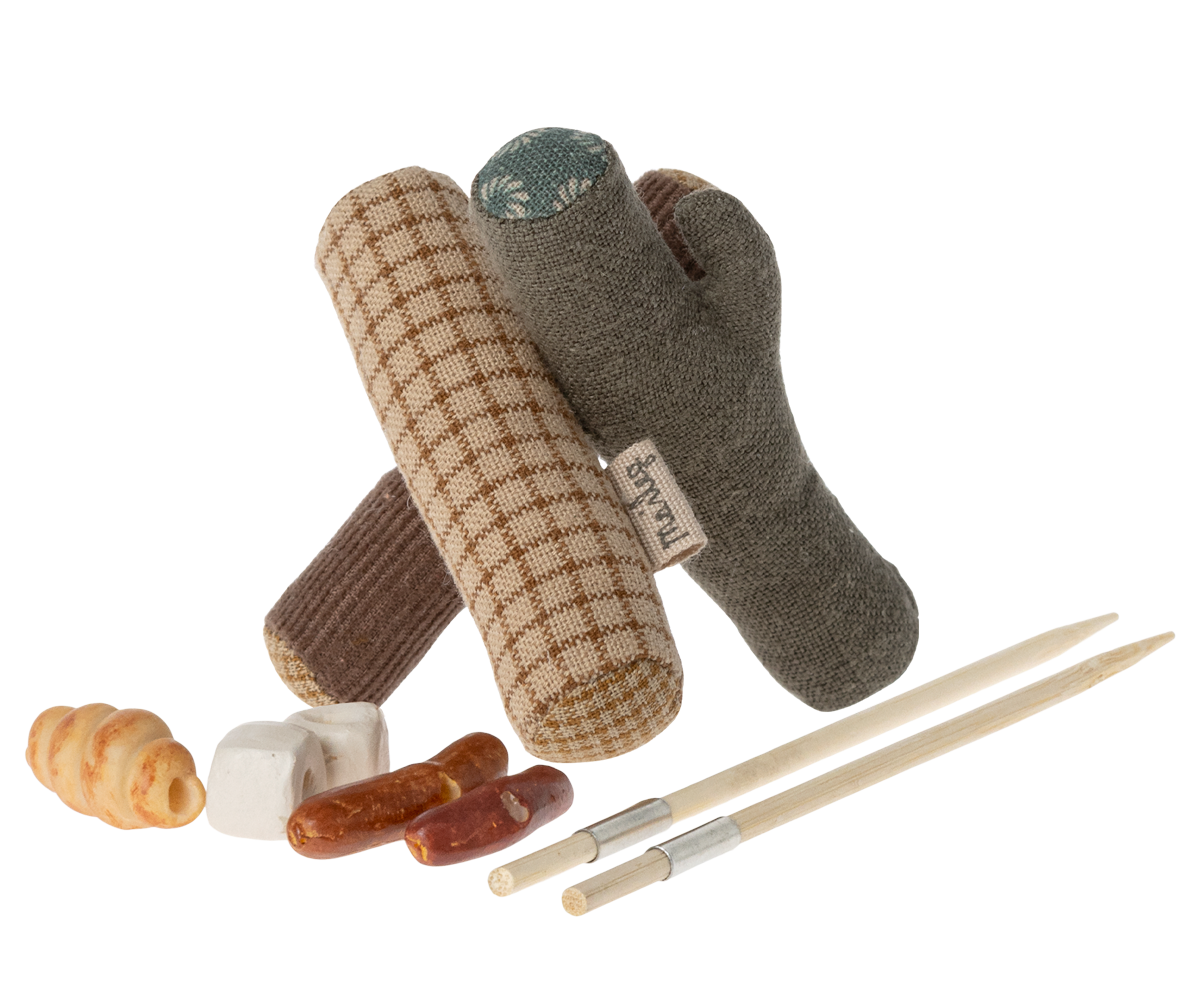 Jedźmy pod namioty! Nasz uroczy zestaw na ognisko jest idealnym uzupełnieniem naszej opowieści o turystach. Do patyka można dodać pianki, chleb i kiełbaski, a myszy mogą trzymać go nad ogniskiem z tkaniny. Nasze myszy turystyczne zostały wyposażone w magnesy w łapach, aby mogły trzymać kije przy ognisku. Upewnij się, że masz nasz termos i kubki, aby nasze myszy mogły mieć coś do picia wraz z przekąską. Dodaj naszą gumową łódkę na weekend pełen przygód!