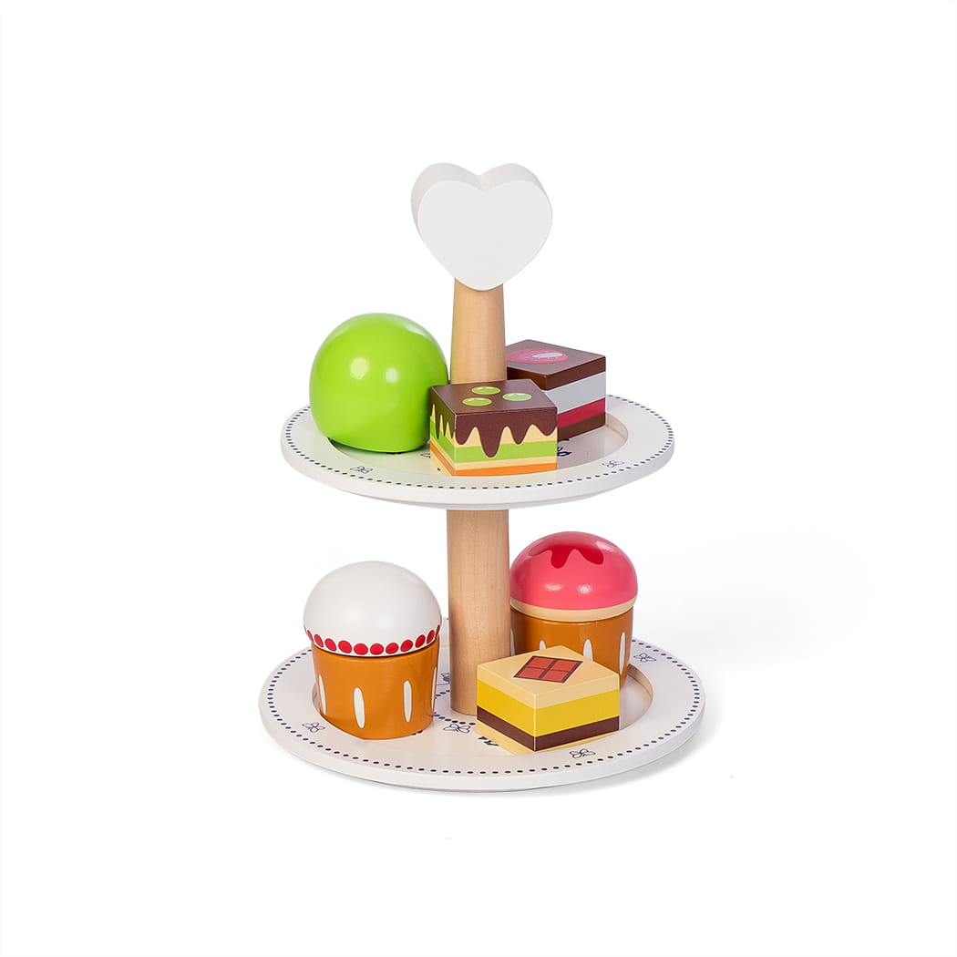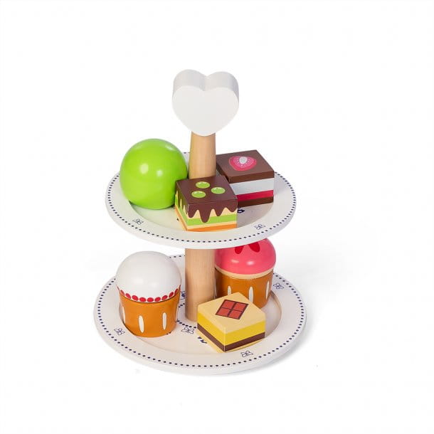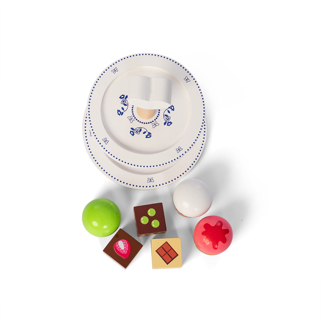 6 pysznych ciast podanych na białej paterce z niebieskim wzorem "królewskim" od duńskiej marki Mamamemo