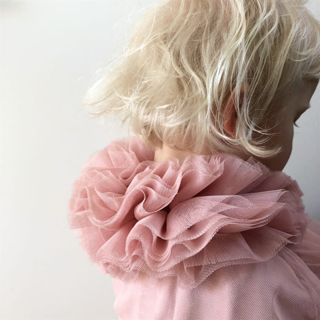 Kołnierz jest wykonany z 16 warstw tiulu, dzięki czemu jest obszerny i wyprostowany, a peleryna zapinana jest pod szyją na rzep.