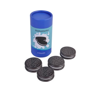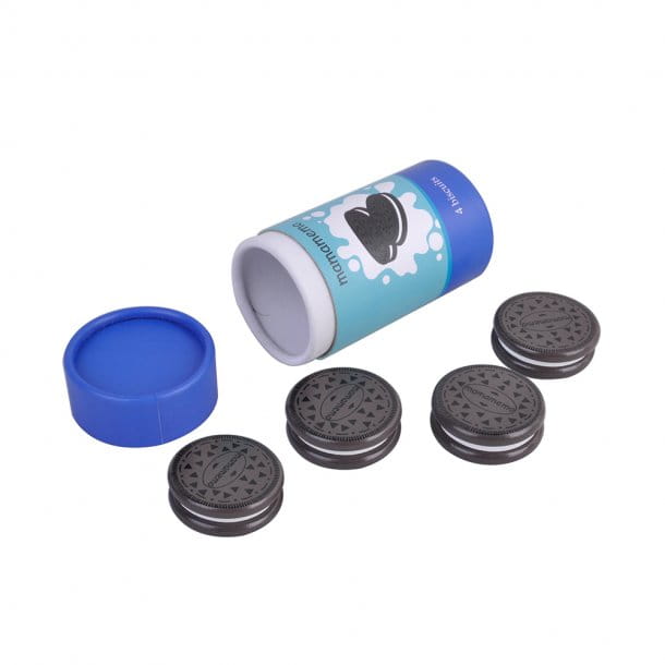 4 pyszne ciastka czekoladowe w kartonowej tubie, jako uzupełnienie kuchenny akcesoriów do zabawy dla dzieci.