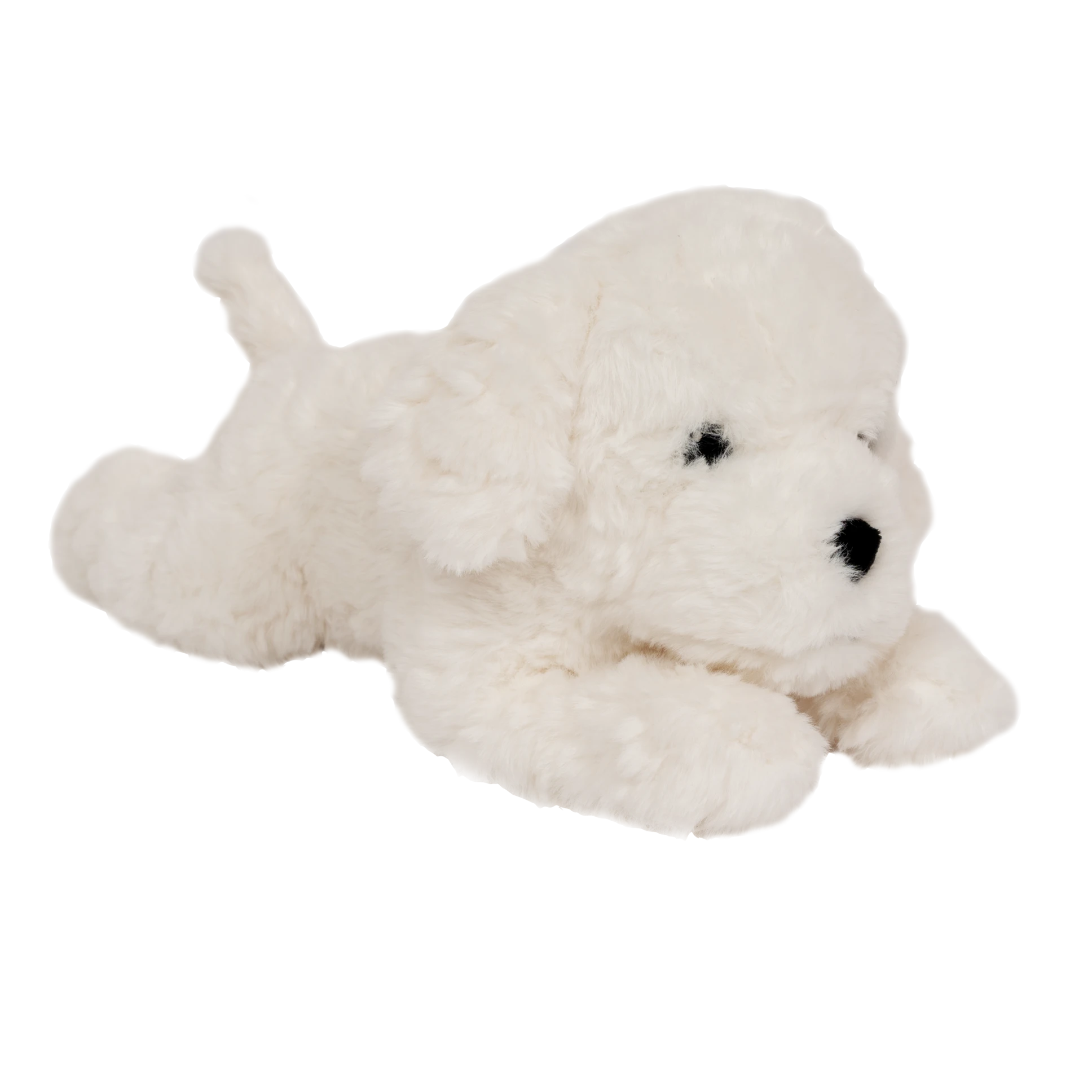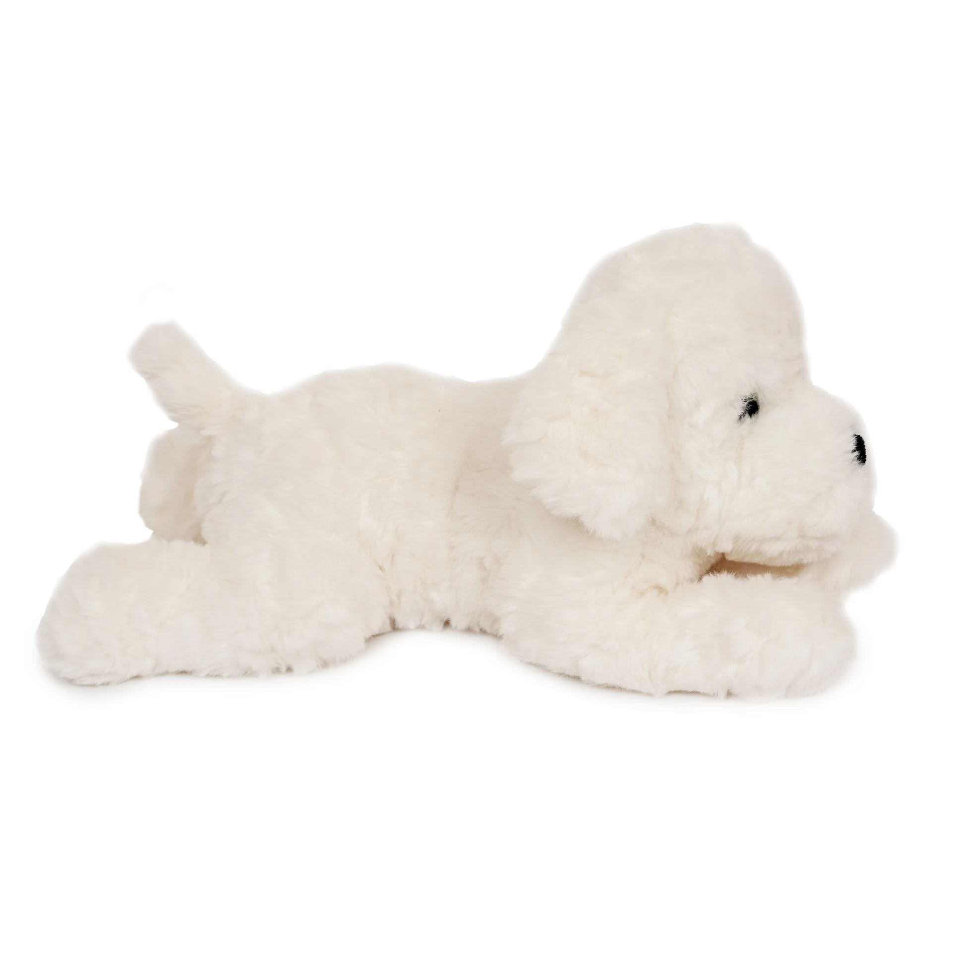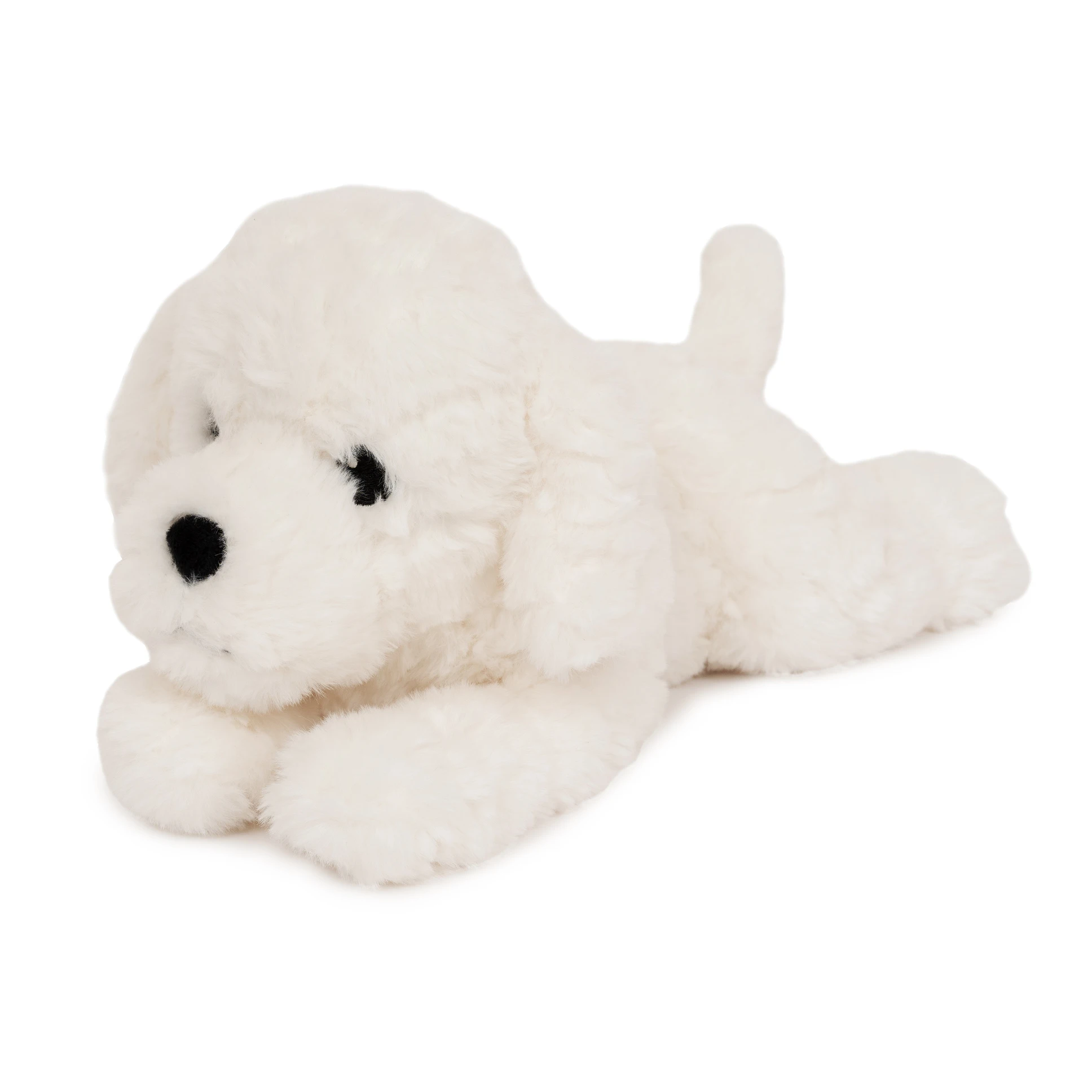 Mały, obciążony, bawełniany piesek, zaprojektowany z myślą o komforcie i spokoju. Ważący 0,6 kg, o ultramiękkim, białym, kręconym futerku i łagodnym wyrazie twarzy, jest atrakcyjnym, ponadczasowym towarzyszem pokoju dziecięcego i dodatkiem do prezentów.