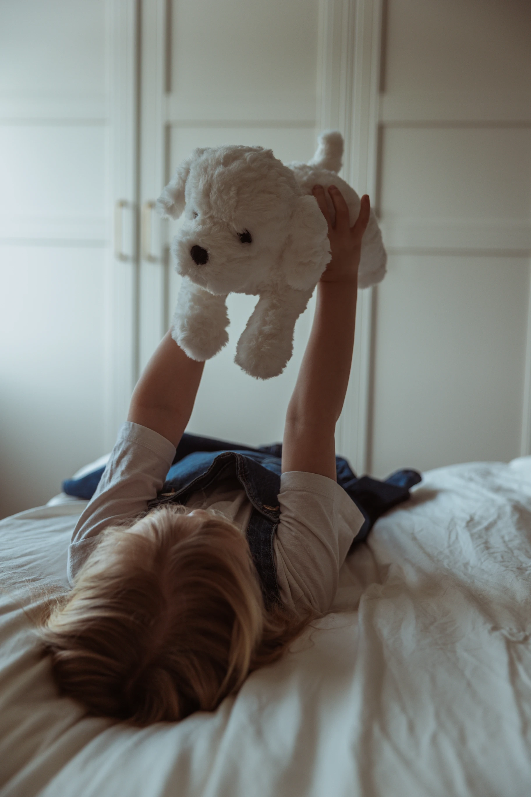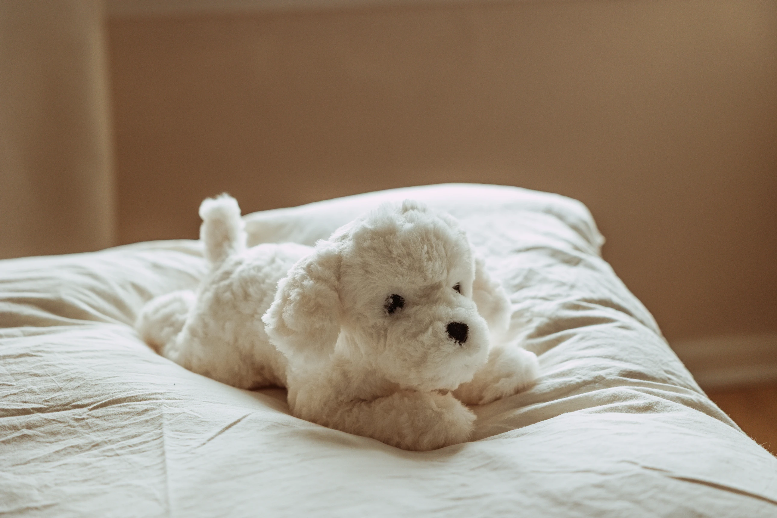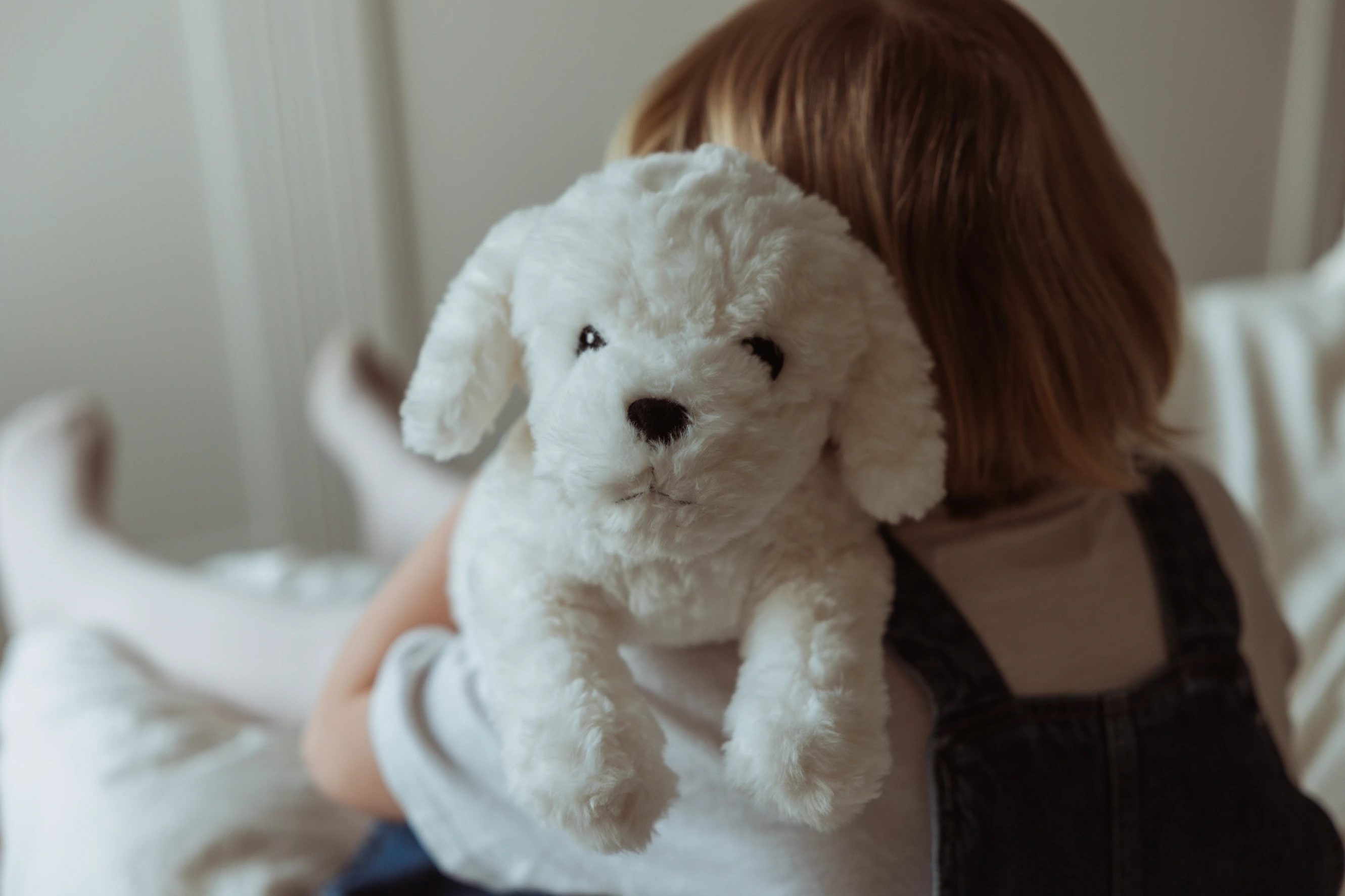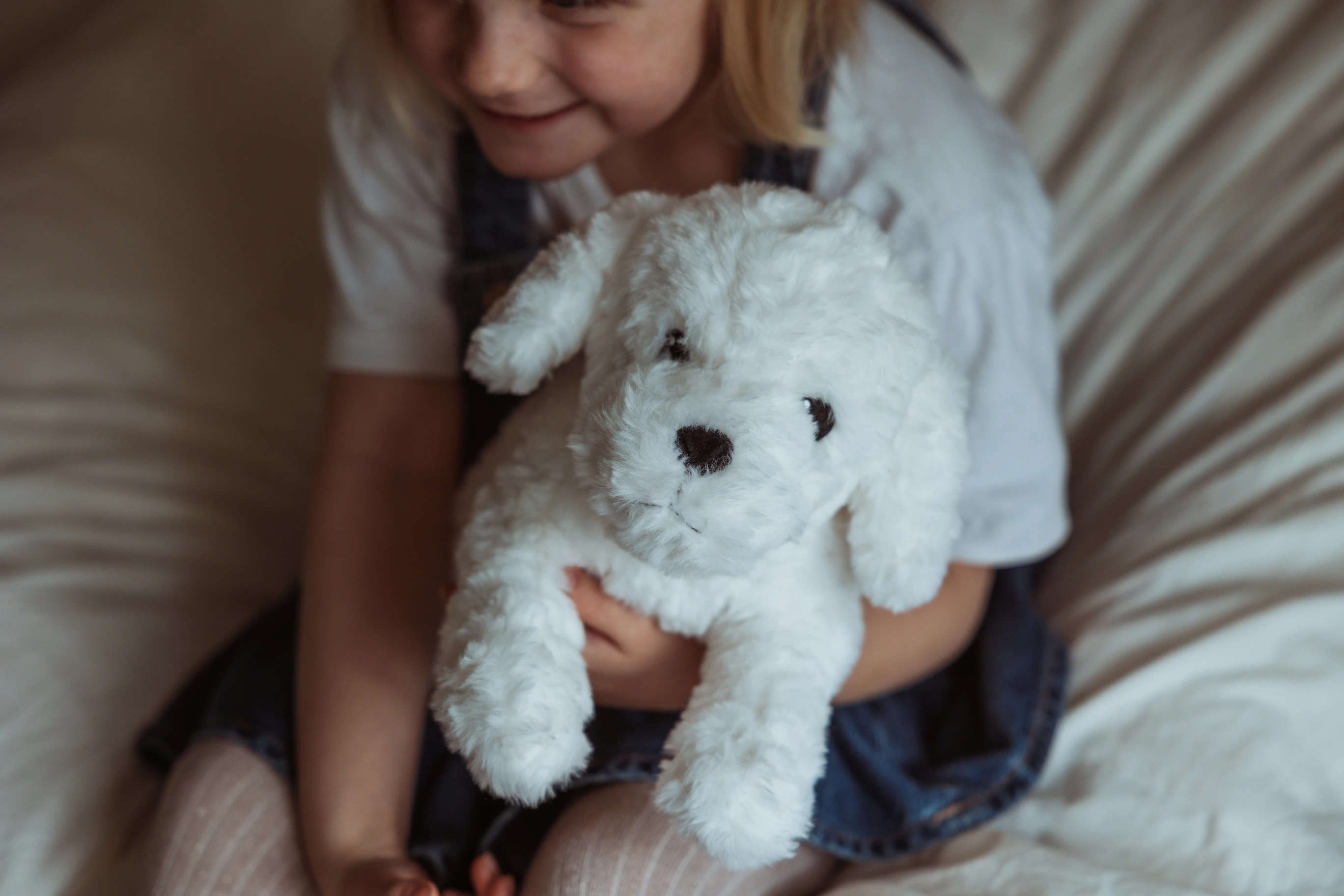 Mały, obciążony, bawełniany piesek, zaprojektowany z myślą o komforcie i spokoju. Ważący 0,6 kg, o ultramiękkim, białym, kręconym futerku i łagodnym wyrazie twarzy, jest atrakcyjnym, ponadczasowym towarzyszem pokoju dziecięcego i dodatkiem do prezentów.