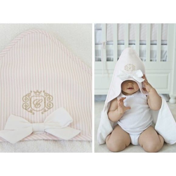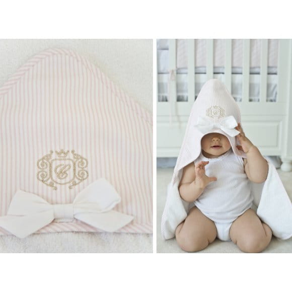 Elegancki ręczniczek uszyty z białej tkaniny frotte. Pudrowy kapturek w paseczki ozdobiony eleganckim złotym emblematem i uroczą kokardką. Rozmiar ręcznika jest większy niż ogólnie dostępnych na rynku. Nadaje się dla niemowlęcia oraz dla starszego dziecka. Doskonały na prezent - zapakowany w piękne firmowe pudełko.