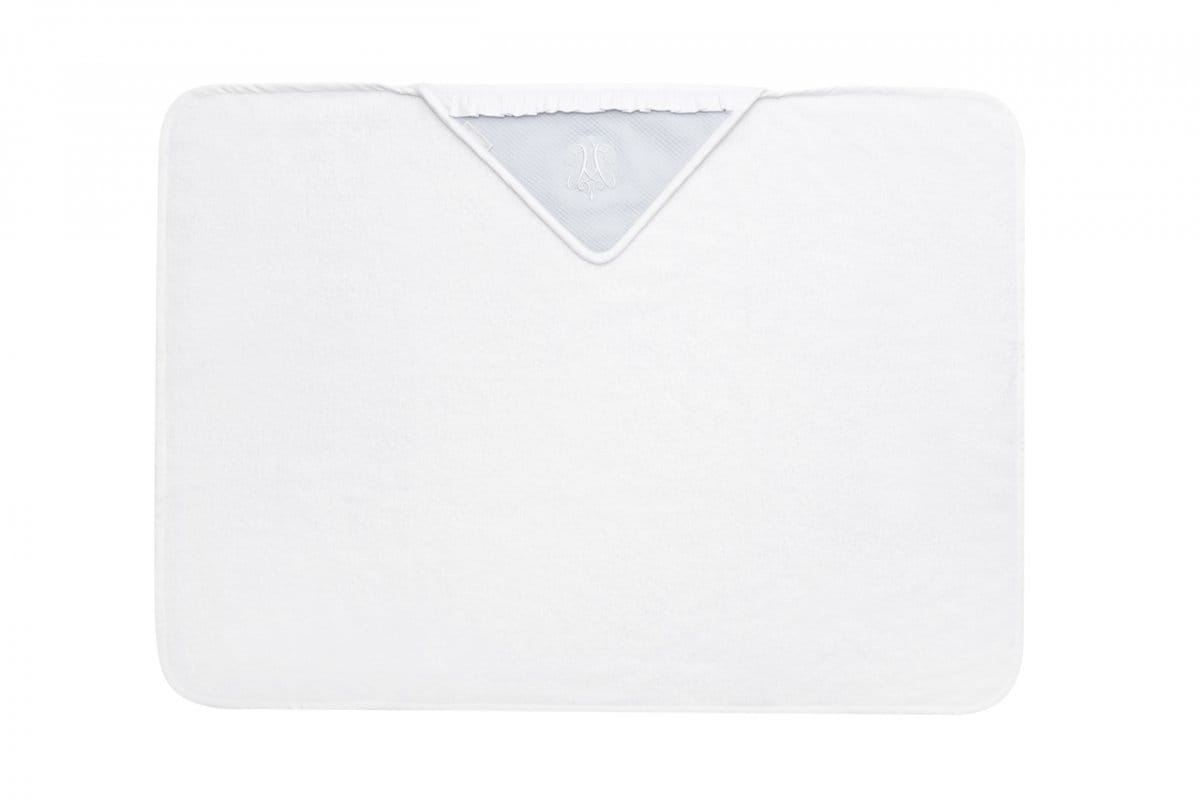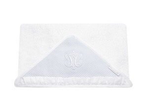 Elegancki ręczniczek uszyty z białej tkaniny frotte oraz ozdobnej części z szarej goferkowej bawełny.