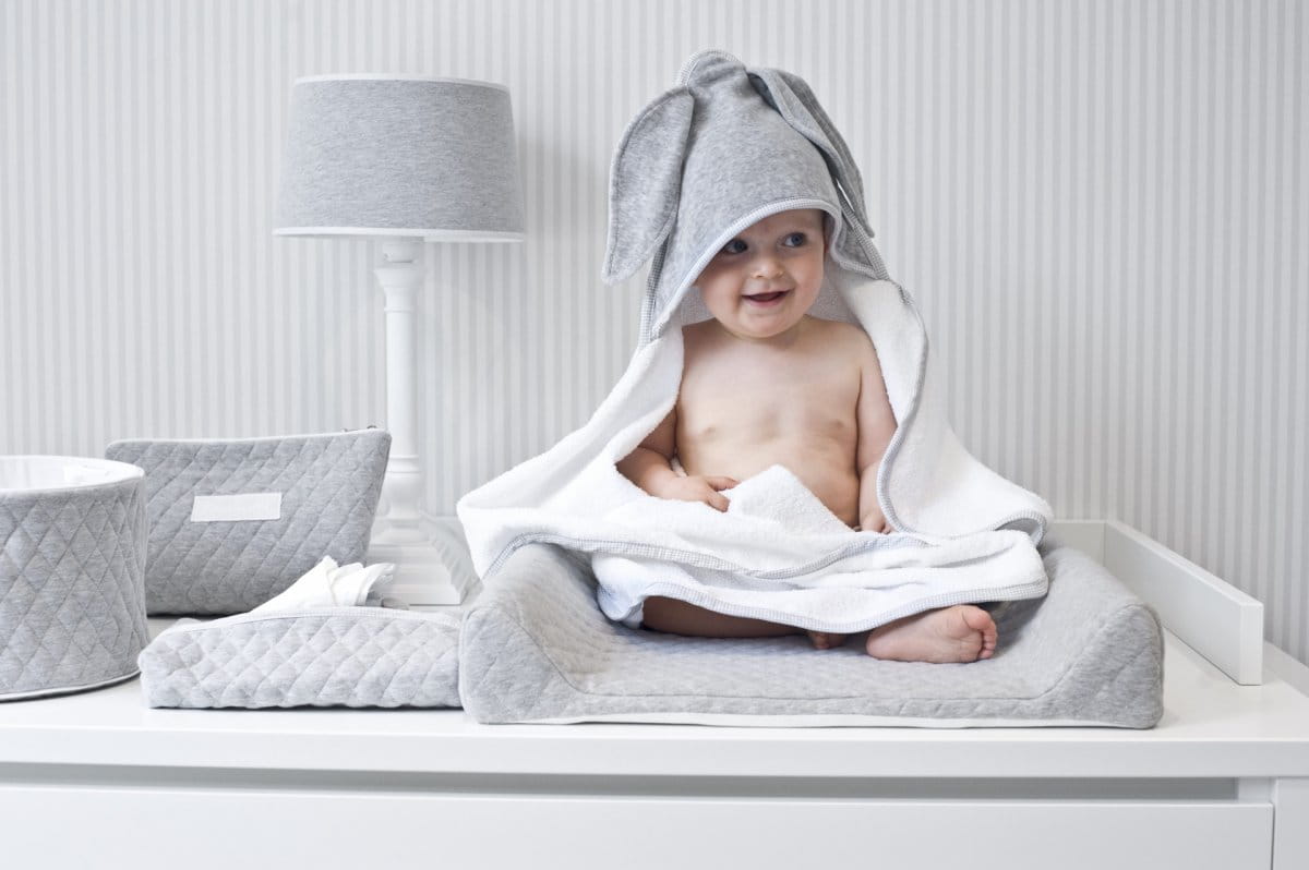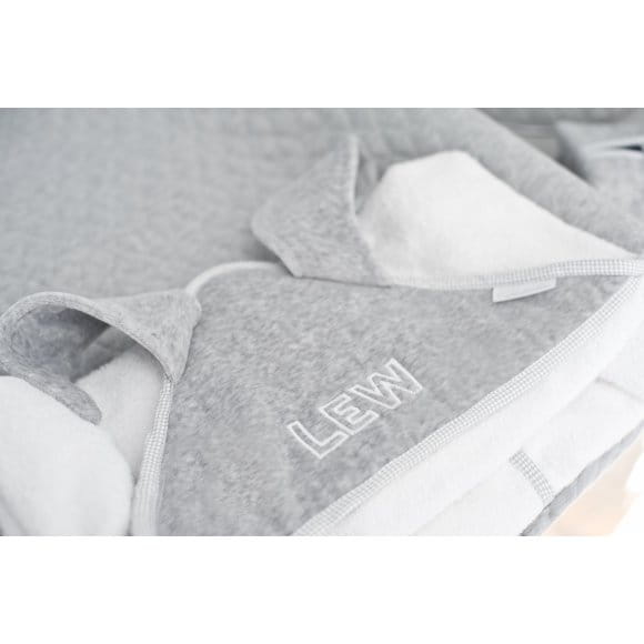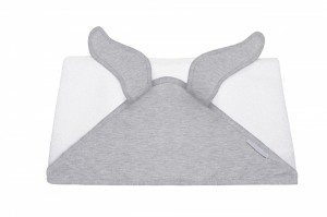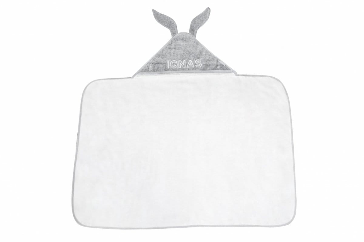Uroczy ręczniczek uszyty z białej tkaniny frotte oraz miękiej szarej bawełny. Wykończony jest dekoracyjnymi uszkami przy kapturku. Jego rozmiar jest większy niż ogólnie dostępnych na rynku. Nadaje się dla niemowlęcia oraz dla starszego dziecka. Doskonały na prezent - zapakowany w piękne firmowe pudełko. Istnieje możliwość personalizacji za dodatkową opłatą.