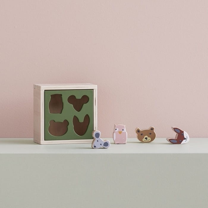 Drewniany sorter z czterema klockami o różnych kształtach łączy w sobie najlepsze cechy zabawek manualnych oraz rozwijających zdolności rozumowania. Postacie zwierzątek - niedźwiedź Max, mysz Tor, lis Ed, sowa Ola i kolory klocków sprawią, że zabawa nimi będzie przyjemna i edukacyjna. Podczas zabawy dzieci uczą się rozpoznawania zwierzątek kolorów oraz precyzyjności podczas wrzucania klocków do odpowiednich otworów. Gdy dziecko umieści wszystkie klocki w sorterze, może po prostu otworzyć wieko i zacząć zabawę od nowa. Zarówno klocki jak i pudełko zostały wykonane z wysokiej jakości materiałów. Zabawka inspiruje malucha do kreatywnej zabawy.