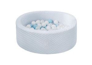 Coraz bardziej popularny produkt - suchy basen z kulkami. Zapewnia doskonałą zabawę wspomagając jednocześnie rozwój sensoryczny i motoryczny dziecka. Na początku może być używany jako kojec, później jako basen z piłeczkami. Błękitny pikowany pokrowiec zapinany jest na suwak, co pozwala łatwo go zdjąć do prania, jak również wyjąć wewnętrzną gąbkę. Obszycie ozdobione jest eleganckim białym firmowym emblematem.