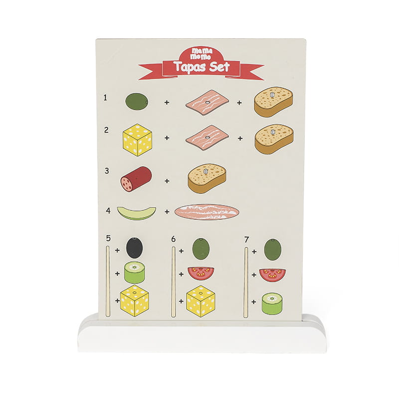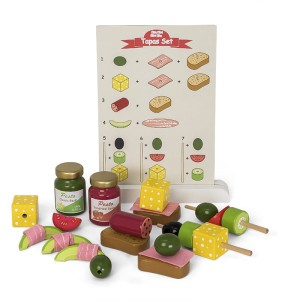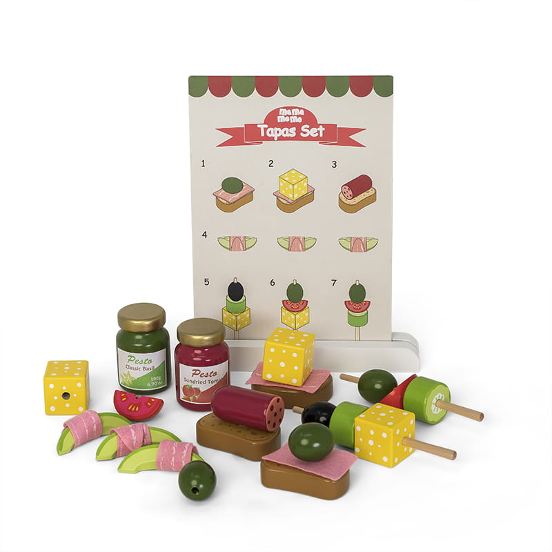 Drewniany zestaw tapas od duńskiego MaMaMeMo. Jeśli masz już sklep ze słodyczami, możesz go przerobić i zamiast tego sprzedawać tapas - lub po prostu podawać tapas mamie i tacie. W zestawie: czerwone i zielone pesto, 3 szt. sera, 4 oliwki, 3 szt. awokado, 2 kawałki pomidorów, 3 kromki chleba, kiełbasa, 2 ogórki, różne szynki, 2 paluszki i karta menu - bez podstawki na kartę.