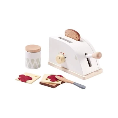 Drewniana zabawka jest świetną propozycją dla dzieci w wieku powyżej 3 lat, które chętnie pomagają rodzicom w kuchni. Zestaw zawiera 8 akcesorii: toster, dwie kromki chleba, 2 plasterki sera, słoik z dżemem i nóż do smarowania. Aby zrobić kromki w tosterze należy nacisnąć dźwignię na boku urządzenia, obrócić pokrętło, aby ustawić ciepło i tosty gotowe :) Całość starannie wykończona i bezpieczna w użytkowaniu. Zaproś wszystkich najlepszych przyjaciół na popołudniowe przepyszne tosty. Produkt przeznaczony jest dla dzieci w wieku powyżej 3 lat, które lubią zabawy w przygotowywanie jedzenia i przyjmowanie gości. Zabawa zestawem rozwija zdolności ruchowe oraz wyobraźnię dziecka. Zabawka inspiruje dzieci do kreatywnej zabawy. Uroczo zapakowane w kartonowe pudełeczko będzie idealnym prezentem.