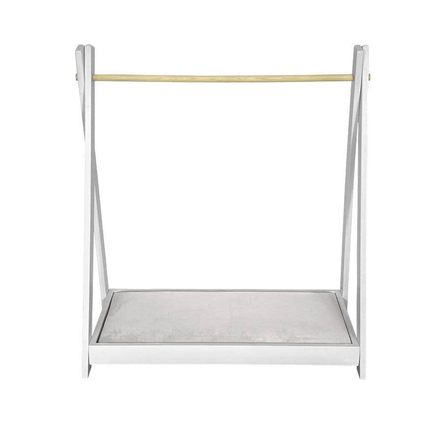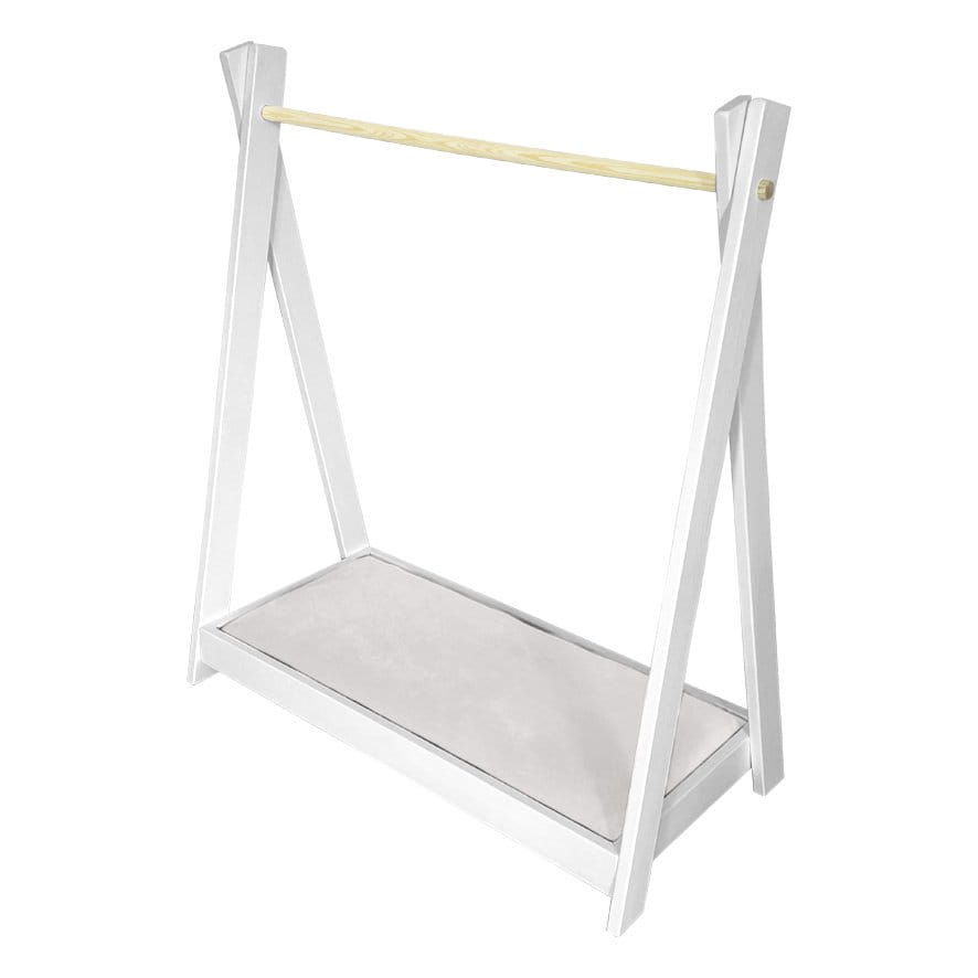 Uroczy i funkcjonalny biały wieszaczek z tapicerowaną półeczką w odcieniu jasnego beżu. Świetnie sprawdzi się w pokoiku dziecięcym jako dodatkowa przestrzeń do przechowywania ubranek.
