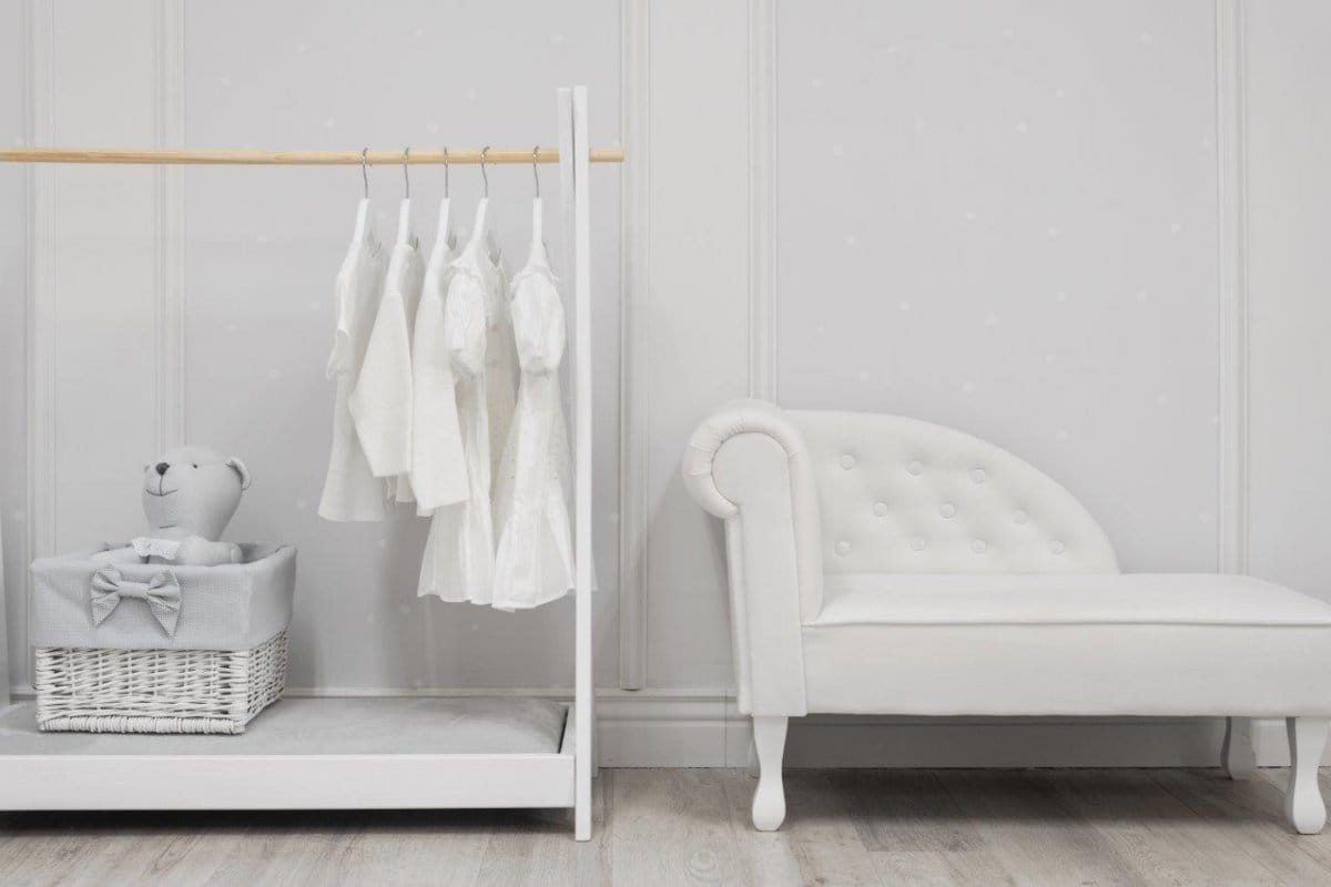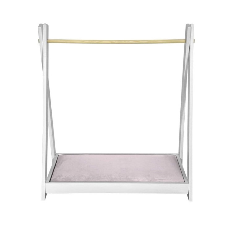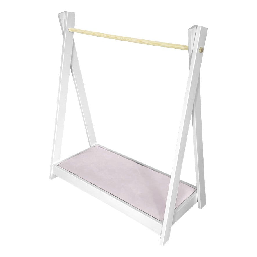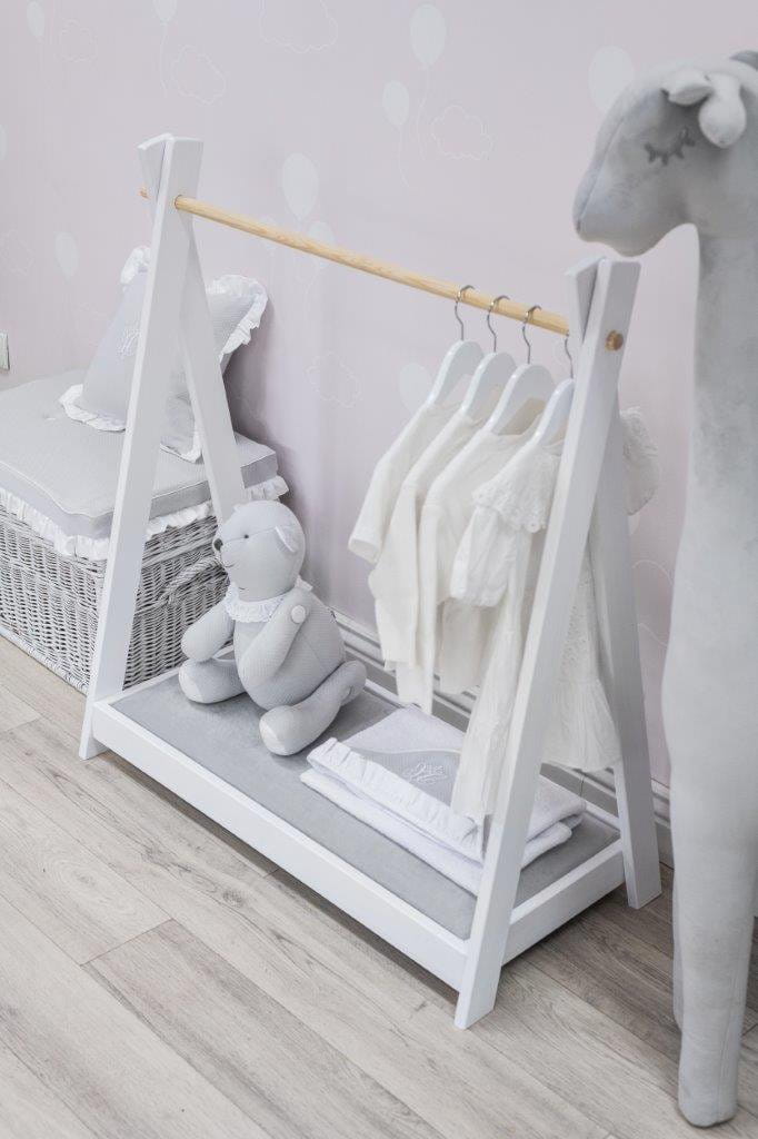 Uroczy i funkcjonalny biały wieszaczek z tapicerowaną półeczką w odcieniu pudrowego różu. Świetnie sprawdzi się w pokoiku dziecięcym jako dodatkowa przestrzeń do przechowywania ubranek.