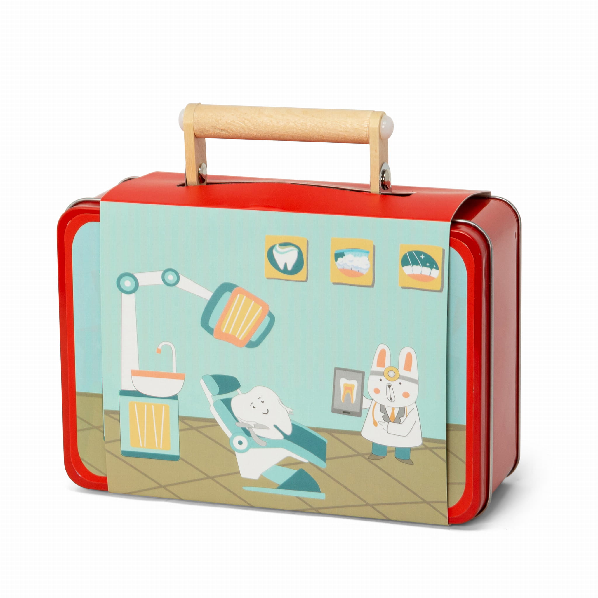 7 elementowy zestaw do odgrywania roli w małego dentysty, zapakowany w metalową walizkę.
